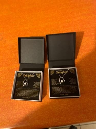 Two-toned box or Mahogany style box with built-in led spotlight that lights upon the necklace and the message card, making it more special.