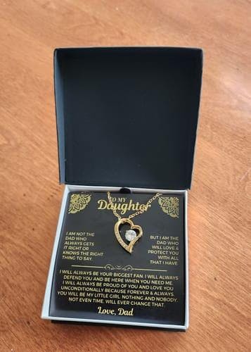 "TO MY DAUGHTER - I am not the Dad who always gets it right or knows the right thing to say, but I am the Dad who will love & protect you with all that I have. I will always be your biggest fan, I will always defend you and be here when you need me, I will always be proud of you and love you unconditionally because forever & always, you will be my little girl. Nothing and nobody, not even time will ever change that. LOVE, DAD"
